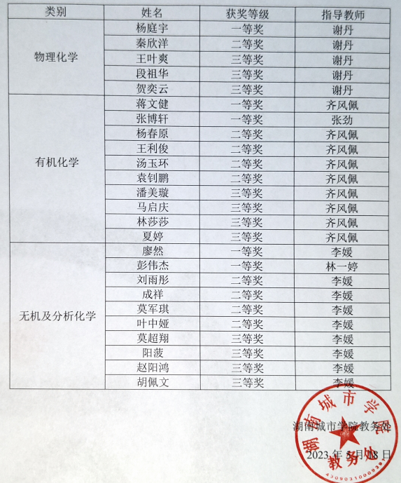 为迎接2023年7月在湖南科技学院举办的湖南省大学生化学化工学科竞赛,按照省赛模式,76net必赢线路检测中心于5月15日晚举行了初试(理论考试),共80名同学参加。根据初试成绩,33位同学进入复试(实验考试),复试于5月17日下午进行,最终25名同学获得相应奖项,获奖名单如下: