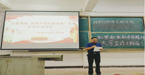 为庆祝中国共产党成立100周年,重温党的光辉历程,歌颂党的伟大成就,继承和发扬党的优良革命传统,充分展示学生的爱党爱国爱社会主义的深厚情怀,根据“党史照亮青春路”红色主题教育活动安排,76net必赢线路检测中心于5月10日晚在1教409教室举行主题为“礼敬赞歌 致敬中国科研精神”主题诗歌朗诵决赛。材化院党总支副书记钟桐生教授出席并讲话,并邀请人文学院蔡凤老师、化工系曾永林老师院团委指导老师田雪萍和学生会主席团任评委。