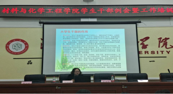 会议上,院团委学生副书记蔡欣怡领学《材化院学生干部管理条例》。随后,院团委书记田雪萍老师对学生干部进行了主题为《大学生干部的作用和具备的五大素质》的工作培训,田老师首先指出大学生干部要做好助手、桥梁、凝聚、服务作用,要以身作则,成为同学学习效仿的榜样,关于学生干部要具备怎么样的素质,田老师指出在日常工作中学生干部一应具备仪表、言谈和仪态举止等基本礼仪;二应具备思想和道德等基本素质;三应具备安全、责任和创新等基本意识;四应具备交际、表达和组织管理等基本能力;五应处理好与老师、同学和干部之间等若干关系。