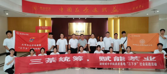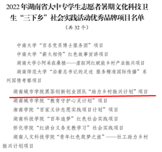 2023年2月3日,省委宣传部、团省委、省教工委、省教育厅、省文明办、省志工办、省学联联合发布了《关于2022年湖南省大中专学生志愿者暑期文化科技卫生“三下乡”社会实践活动优秀单位、优秀服务团队、优秀指导者、优秀个人、优秀品牌项目的通报》,我院黑茶创新创业团队“助力乡村振兴计划”社会实践项目入选湖南省“三下乡”社会实践优秀品牌项目,成为全省32个优秀品牌项目之一,这是我院深入落实立德树人根本任务、深化共青团实践育人成效的重要体现。