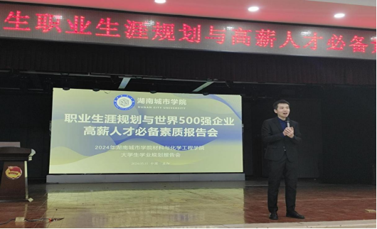 (材化院通讯员 刘嘉馨)2024年3月11日晚7点,材化院大学生职业生涯规划专题报告会在学校大学生活动中心举办。讲座由湖南大学干部培训中心吴振华主讲,学院学工办主任、就业专干徐晨曦与2022级全体学生参加了报告会。