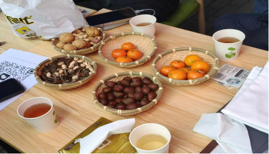 本次活动以无门槛、轻互动形式面向全校师生开放,活动现场搭建起两顶帐篷作为简易茶歇区,热水壶、排插等设备一应俱全。茶艺社社员化身“暖心茶艺使者”,主动为路过师生递上暖心茶饮;茶歇区桌面摆放果切、坚果等零食,师生可自由取用、随意落座,围绕年度趣事、当下烦恼及新年计划展开自由交流,在氤氲茶香中放松身心、舒缓压力。