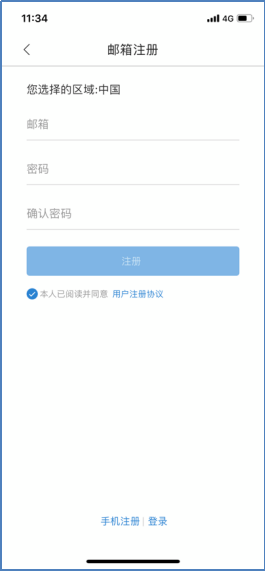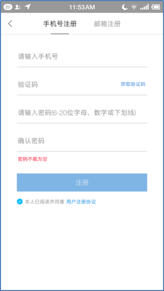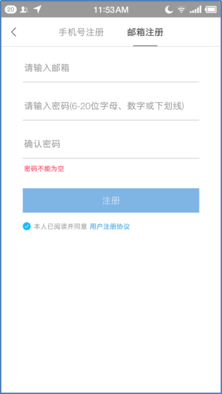 点击首页右下角的“我的”,再点击“登录”即可进入注册页面,通过手机和邮箱两种方式完成注册(如图2-1、图2-2所示)。