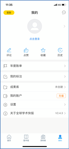 扫描下面的二维码,下载并安装全球学术快报APP,安装好的显示(如图1所示)。