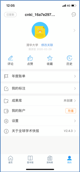 完成注册后,输入用户名和密码登录进入系统。点击头像图标,将必要的个人信息如实补充完毕,邮箱最好填机构邮箱,kcx111@mails.tsinghua.edu.cn,机构务必填写完整,如填北京大学而非“北大”,北京师范大学而非“北师大”,上海交通大学而非“上交大”,以便准确认证。知网将通过位置、IP、机构名称、姓名等信息,采用大数据分析方式认证用户的合法性。