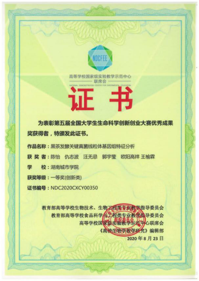 本届大赛覆盖全国302所高校3687支队伍,参赛学生共14000余名。疫情防控常态化下,本届大赛决赛首次开启“云”答辩,通过评委线下集中、现场亮分,参赛队伍视频汇报、线上答辩的方式进行。由我校徐正刚、胡治远老师指导,陈怡、仇志波等学生参加的作品《黑茶发酵关键真菌线粒体基因组特征分析》经过充分的前期准备工作,荣获全国创新类一等奖,展现了我院学子过硬的专业素养以及优异的科研创新能力。