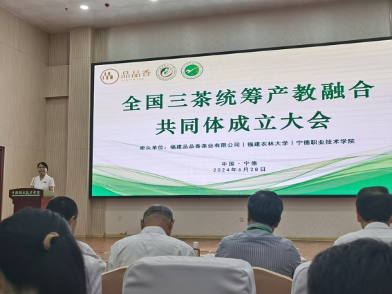 宁德市人民政府副市长刘笃凡出席并致辞。中国茶叶学会理事长,中国农业科学院茶叶研究所所长、党委副书记姜仁华,安徽农业大学茶树生物学与资源利用国家重点实验室主任宛晓春,福建省政协教科卫体委员会副主任刘健,宁德师范学院党委书记夏良玉,海峡两岸茶业交流协会副会长陈爱平,福建省茶叶学会副会长邹荣贵,宁德职业技术学院原党委书记林浩云,宁德市教育局局长郭海鸣,福建农林大学安溪茶学院、数字经济学院院长郭玉琼,福建省农业科学院茶叶研究所所长陈常颂,宁德市农业农村局三级调研员、宁德市茶产业发展中心负责人李辉,福安市人大常委会党组书记、主任陈昌东,福建品品香茶业有限公司董事长林振传,八马茶业股份有限公司董事长王文礼,以及来自北京、江苏、浙江、安徽、福建、湖南、河南等15个省份的7所本科高校、17所职业院校、4个科研院所、5个行业协会、36家企业的共同体成员单位代表,宁德职业技术学院党委书记陈建华等校领导班子成员,相关部门、学院负责人及茶界代表齐聚一堂,共同见证这一重要时刻。成立大会由宁德职业技术学院党委副书记、校长陈群主持。