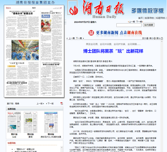 2024年07月27日,湖南日报综合版以“黑茶金花酒、金花沐浴露、金花护发素、金花面膜……博士团队将黑茶‘玩’出新花样”报道学院黑茶博士团队在黑茶金花精深加工方面取得的成绩。报道网址: