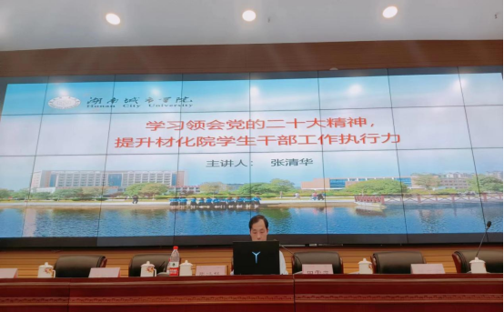 (材化院通讯员 张萌) 为深入学习领会党的二十大精神,进一步提升材化院学生干部的理论素养和工作能力,切实发挥学生组织的先进性和主动性。10月24日晚8:30,院团委学生会在图书馆报告厅举办新任学生干部素质能力培训。本次培训邀请了院党委副书记张清华老师主讲,培训主题:学习领会党的二十大精神,提升学生干部工作执行力。院团委书记田雪萍主持了培训。