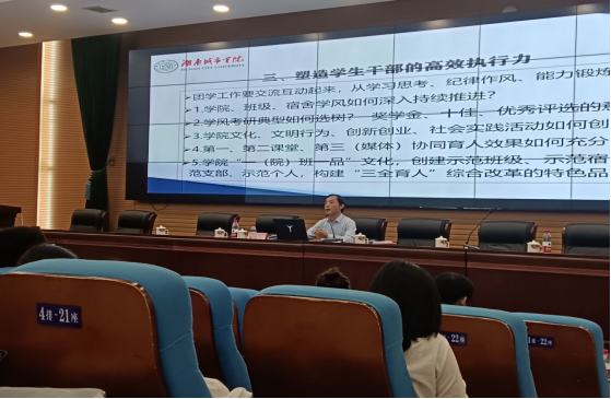 培训开始前,张书记解读了习近平总书记在党的二十大报告中对青年的殷切期望和具体要求,作为新时代青年,我们要认真学习领会讲话精神,坚定不移听党话、跟党走,怀抱梦想又脚踏实地,敢想敢为又善作善成。立志做有理想、敢担当、能吃苦、肯奋斗的新时代合格建设者和可靠接班人。接着从学生干部工作执行力的定义、工作执行力的现状以及提升学生干部工作执行力的途径三个方面,阐述提升学生干部执行力的重要意义和具体方法。最后,他强调作为干部,要做到先行一步、主动思考、积极执行、勇于担当、沉着果断、迎难而上,充分发挥学生干部在学院学生自我教育、自我管理、自我服务、自我提升中的模范作用,讲座在掌声中圆满结束。