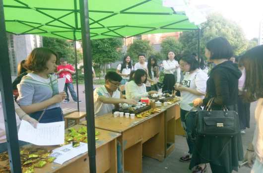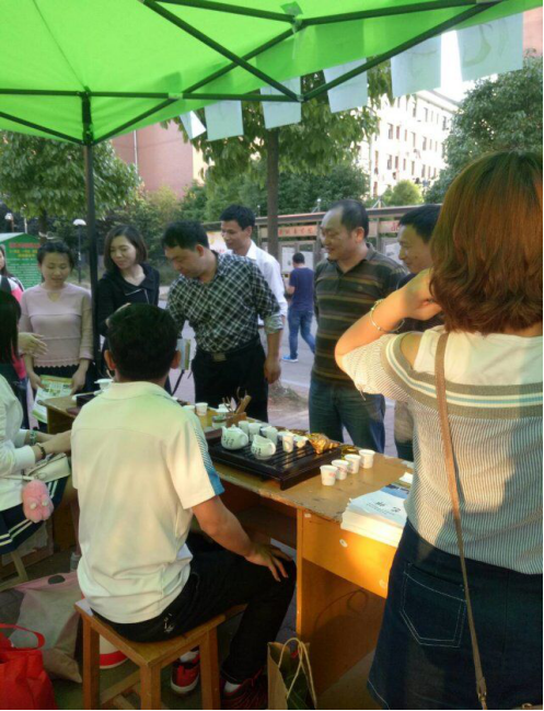 活动在5.10下午新食堂门口17:30正式开始,现场参与者通过玩抽字念诗或者茶文化知识竞猜游戏,再去展板区写下自己的祝福愿望扫描赞助商二维码便可参与现场抽奖。我们在活动现场安排了茶艺表演,现场所有人都可以品茶,为了吸引更多人来参与活动,我们租用音响播放了提前准备好了的音频。