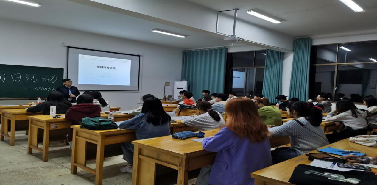 在此次团日活动讲座中,王峰老师围绕考研的内容和复习准备流程,给同学们讲解了关于考研的知识。王峰老师将“考研的准备”分为“选学校、选专业”“复习”“报名考试”“调剂”“复试”“大四学生如何学习”“校内考研资料”七个部分给同学们进行了细致的介绍。其中“复习”这一部分讲解得尤为详细,使同学们了解了考研科目的复习时间安排和一些复习小技巧。最后,王峰老师给同学们推荐了几种获取考研资源的途径,包括线下的书籍资源和我们学校网站提供的线上资源。通过此次团日活动,同学们对于考研都有了更深认识和了解。