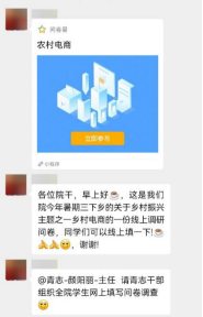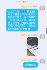 团队成员通过在QQ群、微信群分享调查问卷的方式,向各年级学生或亲朋好友咨询有关农村电商的看法和意见。