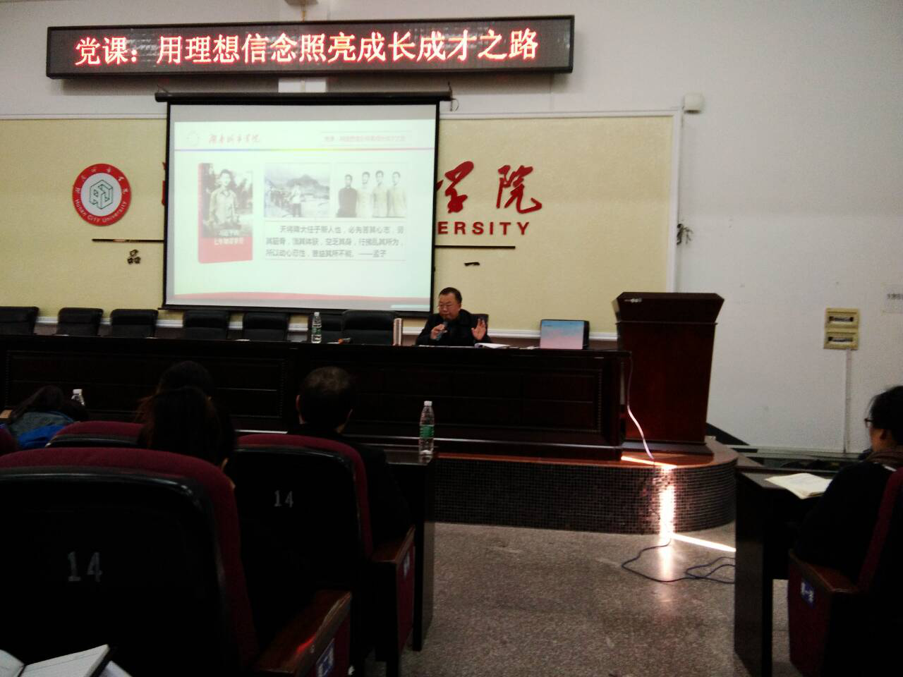 肖爱民教授以《习近平的七年知青岁月》这本书开始了本次的主题党课,给大家讲述了1969年习主席下放到陕西梁家河做知青,并引用“天将降大任于是人也,必先苦其心志,劳其筋骨,饿其体肤,空乏其身,行拂乱其所为,增益其所不能。”提醒广大青年,实践出真知,青年要成长成才,必须脚踏实地,抓住当下,要敢于迎接挑战,敢于磨练自己。
