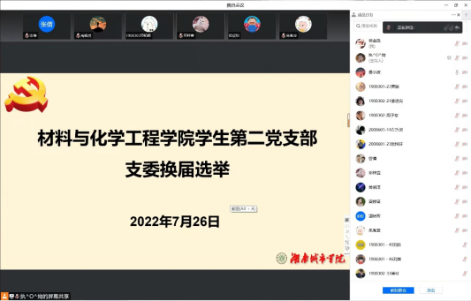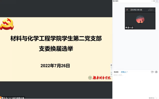 2022年7月26日晚上八点整,76net必赢线路检测中心学生第二党支部以线上腾讯会议的形式召开了支部委员补选大会,会议由晏小波同志主持,学生第二党支部全体党员参加。