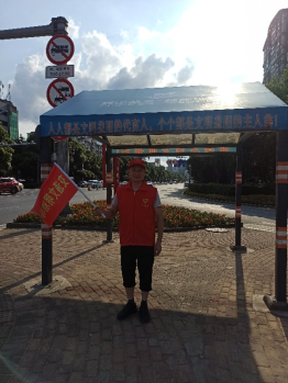 8位身穿红背心、头戴小红帽、手持交通安全提示旗的教师党员志愿者“变身”文明劝导员,炎炎夏日下在益阳大道与银城大道交叉路口四个主路口“站岗”。