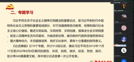 最后,陈艳姣同志对此次活动进行总结。她强调:“全体同志要深入学习与领会《习近平关于社会主义精神文明建设论述摘篇》的内容与精神,要坚定理想信念,践行社会主义核心价值观,要努力推进社会主义精神文明建设,为奋进新征程,建功新时代做出自己的贡献。支部同志要持续开展好“一微一片一实践”活动,寒假在社区、村部等地区的疫情防控中践行全心全意为人民服务的宗旨。(陈艳姣供稿 钟桐生审稿)