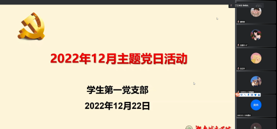 2022年12月22日晚上7点,76net必赢线路检测中心学生第一党支部在线上开展了主题党日活动,活动由学生第一党支部陈艳姣同志主持,学生第一党支部全体党员参加。