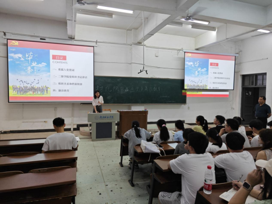 随后,党委书记钟桐生以“廉洁修身,行稳致远”为主题为全体毕业生党员讲授廉洁教育主题党课。衷心期盼各位毕业生党员能够在今后的职业生涯中,扣好廉洁从业、遵纪守法的“第一粒扣子”,真正做到崇廉修德、心存敬畏、慎始敬终,让廉洁成为青春最庄严的底色,走好人生每一步。同时,希望全体毕业生党员在离校之际,能够带头做好文明离校各项工作,发挥好党员的先锋模范作用。