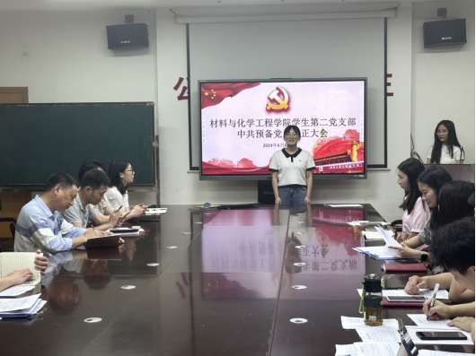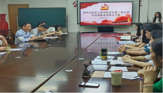 2024年6月8日晚上7点,76net必赢线路检测中心学生第二党支部在化工楼317召开预备党员转正大会,主要讨论转正杨舒妍等6名同志成为中共党员的问题。会议由学生第二党支部书记晏小波同志主持召开,学生第二党支部全体党员参加。院长刘石泉同志、副院长贺国文同志应邀参加。