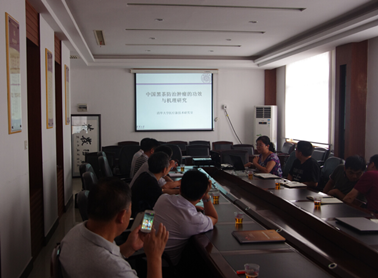 研讨会上,唐教授一行的三位博士分别对黑茶预防肿瘤的功效与机理、茯砖茶及特色菌金花菌保健功效的利用以及多种微生物协同开发植物药物等方面的科研进展进行了汇报。唐教授认为,金花具有卓越的保健价值,如能将其功效成分充分利用,开发出针对当代富贵病防治的食品及药物,其市场潜力将不可估量,这一观念得到了其他在座专家的充分认可。之后,刘石泉副院长对我院黑茶基地的科研工作进行了汇报,主要包括黑茶发酵菌种、黑茶发酵技术优化、黑茶功能成分利用与产品开发三个方面,最后特别就金花应用于降糖、降脂、抗辐射、防腐、天然色素等实验结果进行了深入交流,证明了金花中确实含有大量具备保健作用的活性成分,开发前景巨大。杨耀武局长最后做了总结,强调益阳黑茶研发必须借助清华大学高水平科研平台,扩张黑茶研发方向,加强研发力度、主动适应市场,打造顶级黑茶研发平台,真正为益阳地方经济服务,造福社会。