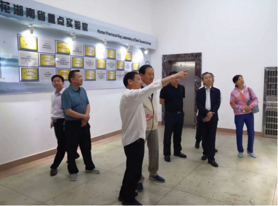 在黑茶金花湖南省重点实验室学术交流中心,夏宏宇副校长主持交流会并致欢迎词,于幼军一行在黑茶学术交流中心与黑茶基地研发人员进行了深入交流研讨,刘石泉主任就实验室的发展历史、研究方向、研究成果等向于幼军一行进行了详细介绍,在介绍结合产学研特色的金花茯茶、金花散茶、金花面膜和金花酒等黑茶金花研发时,于老给予了高度评价,并根据自身体验对黑茶金花在降三高方面的保健功效给予了充分肯定。随后,夏宏宇副校长陪同于幼军一行参观了黑茶金花研究室、黑茶品鉴室和金花酵库等场所。(刘湛军供稿 刘石泉审核)