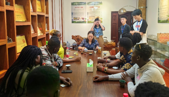 加纳国际交流生们进行泡茶和品茶体验活动,利用基地自制金花散茶、茯砖茶、黄茶、红茶和绿茶进行品评。同学们对中国茶的种类、冲泡方式、滋味等表现出浓厚兴趣,特别是对黑茶基地自制金花茶十分喜爱。(一审:李滔滔 二审:刘石泉 三审:钟桐生)