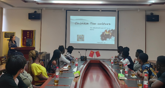 姚教授从中国茶的起源、历史发展、中国茶艺、中国茶道等方面向加纳国际交流生介绍中国茶文化,并针对饮茶器具、茶叶泡饮方式、中国茶叶品类等与学生积极互动。