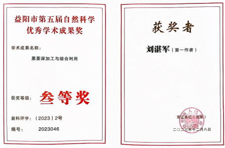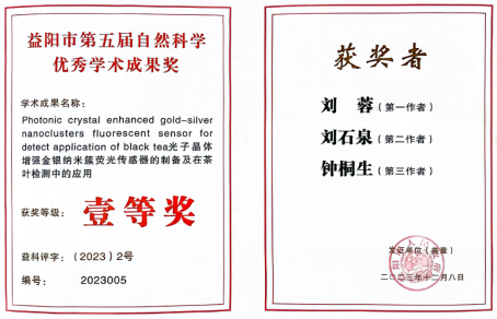 近日,从益阳市自然科学优秀学术成果评审委员会办公室获悉:76net必赢线路检测中心黑茶金花湖南省重点实验室团队成员,刘蓉博士的成果“光子晶体增强金银纳米簇荧光传感器的制备及在茶叶检测中的应用”荣获“益阳市第五届自然科学优秀学术成果奖”一等奖;刘湛军博士的成果“黑茶深加工与综合利用”荣获“益阳市第五届自然科学优秀学术成果奖”三等奖。