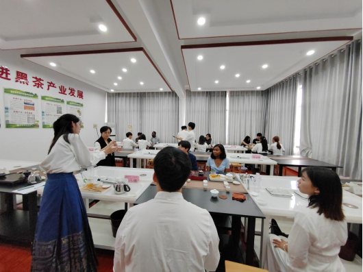 随后,茶会进入实践环节,参与者们通过互动交流与实践练习,不仅掌握了茶艺的基本操作规范,大家还共同品鉴了天尖、千两和茯砖三款经典的安化黑茶产品,深刻体会到了安化黑茶的独特韵味,感受到不同茶叶所带来的不同口感和香气。
