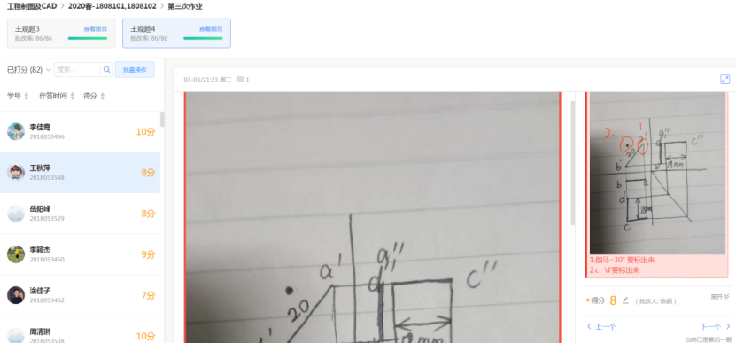 5)课后作业通过雨课堂一键发送到学生端,学生端收到作业发布提醒。设置了答案的客观题目系统将自动完成批改,并给出总体得分情况,学生将主观题答案做在纸上拍照上传,老师可以随时的进行批改,实时反馈给学生。