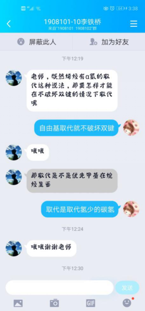 齐风佩老师主讲课程19级化工班的《有机化学》。经过多次尝试, 结合学生的反馈,最终选择用云班课过程控制,腾讯课堂或者QQ分享屏幕直播教学的授课方式。