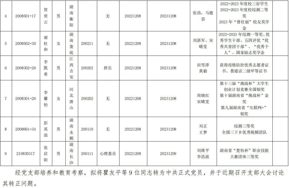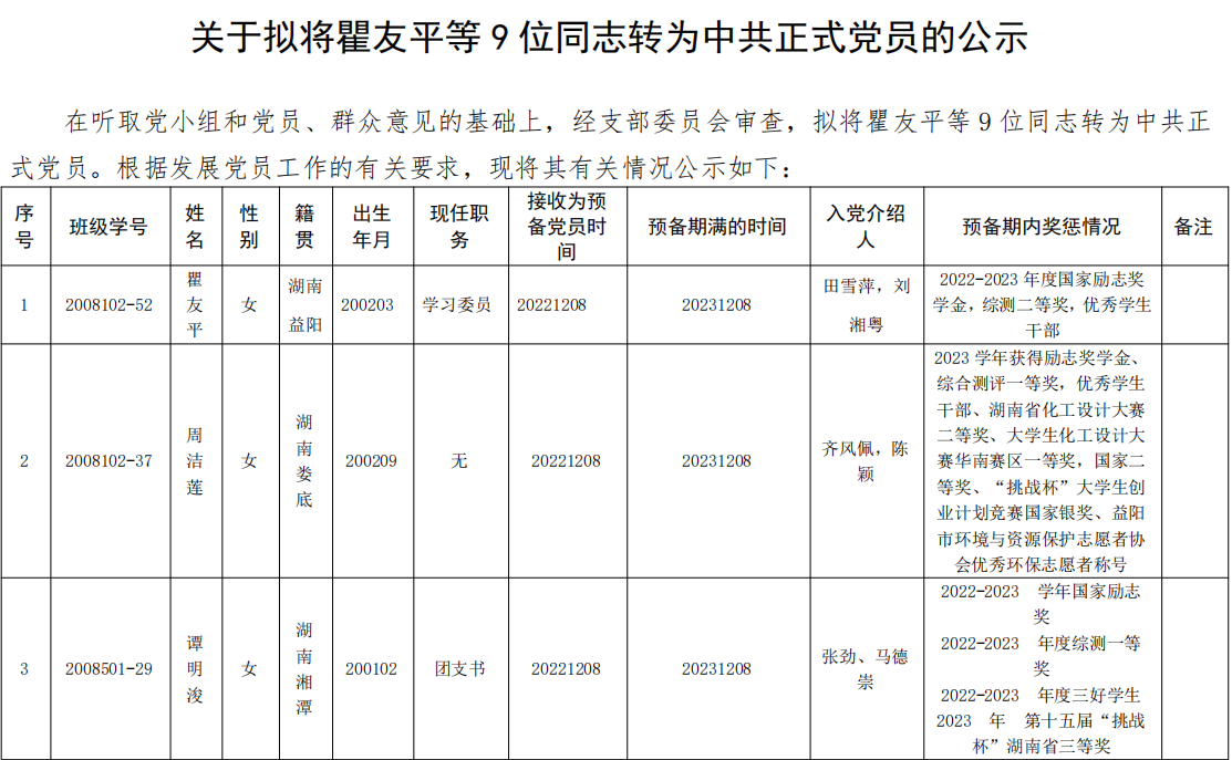 关于拟将瞿友平等 9 位同志转为中共正式党员的公示