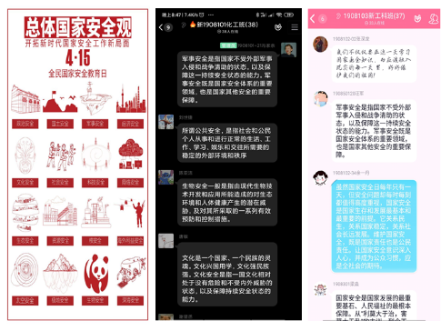 首先,全体师生在线观看公共安全领域专家范维澄先生的《总体国家安全观视角下的疫情防控》主题教育课。视频学习结束后,各班主持人以国家安全为切入点,通过视频和ppt的形式,向同学们介绍“全民国家安全教育日”的由来、设立的意义以及国家安全所涵盖的内容,让同学们对全民国家安全教育日有了进一步的认知。随后,主持人带领大家深入学习了解《国家安全法》、《反恐怖主义法》等具体的国家安全法律法规,进一步介绍了国家安全的基本原则以及当代大学生应当履行的义务,班会过程中,同学们在班级群里展开热烈讨论,纷纷发表自己的认识和感想。