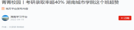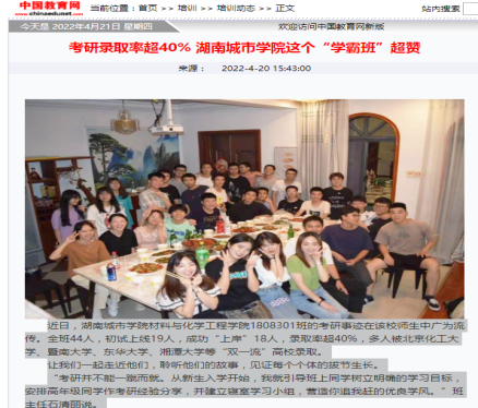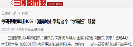 题记:在今年2022届毕业生考研工作中,76net必赢线路检测中心共有197人参考,考研初试上线86人,目前预录取80人,其中1808301班考研共有18人成功“上岸”。学校网站对此事迹报道后,引起了中国教育网、学习强国、新浪网、湖南日报新媒体客户端、湖南教育、红网、三湘都市报、腾讯网、网易网、搜狐网、益阳日报等近十余家媒体专题跟踪报道,在高校和社会上产生强烈反响,现摘录如下: