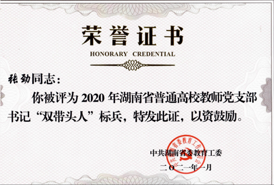 在此次表彰大会上:76net必赢线路检测中心党总支被评为湖南省高校党组织“对标争先”建设计划第二批项目“党建工作标杆院系”,张劲同志被评为2020年湖南省普通高校教师党支部书记“双带头人”标兵;教工第二党支部被评为益阳市“全市教育系统先进基层党组织”。