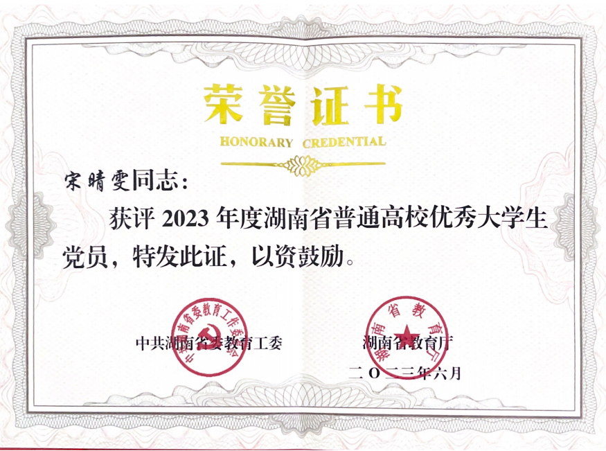 同时本人积极参加课外科技作品竞赛:2023年3月获得第十三届“挑战杯”中国大学生创业计划竞赛银奖(我校历史上第一次在该赛事上获得国家级荣誉);2021年8月获得第十四届“挑战杯”湖南省大学生课外学术科技作品竞赛三等奖;其他互联网+、大创项目等校级奖项若干。在专业证书方面:本人在大一通过CET-4、普通话二乙考试,大二获得计算机优秀等级证书,大三考取高中化学教师资格证等。在2023年全国硕士研究生考试中,成功考取双一流高校(西南交通大学)的全日制研究生。在考研期间,借着支部组织的“四进一表”工作,支部党员深入到学生寝室,疏导缓解大家的紧张情绪、分享自己的学习经验、主动联系学困生,了解其真实需求,协助他们顺利完成补考和缓解备考压力。2023年,学院共毕业生381名,整体考研录取率达25%,为历史新高,同时为全校最高,其中1908103班考研录取率高达到55.2%。支部毕业生党员共26名,研究生上岸人数14名,达到53.8%,此种荣誉离不开支部展开的“四进一表”活动与党员自身所起的模范作用。